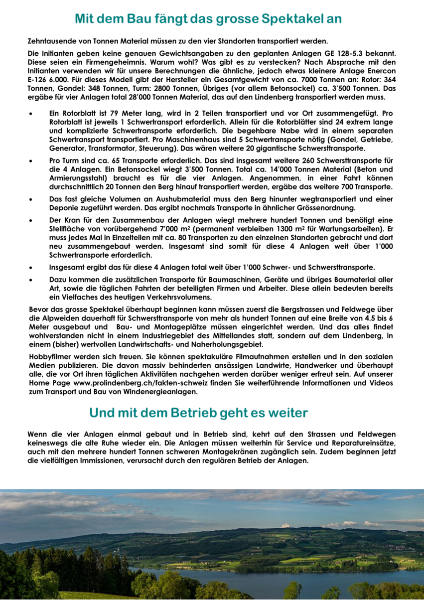 Die geplante Schwachwind-Stromproduktion auf dem Lindenberg rechtfertigt die Immissionen und Risiken nicht. Menschen und Tiere leiden nicht nur während dem Bau und dem Betrieb, sondern auch noch Jahre danach. Die Herstellung mit seltenen Metallen und nicht wiederwendbaren Materialien ist alles andere als sauber. Nach dem kurzen 20-jährigen Betrieb bleiben neben dem Sondermüll auch Landschaftsschäden zurück und es fallen teure Rückbauarbeiten an.