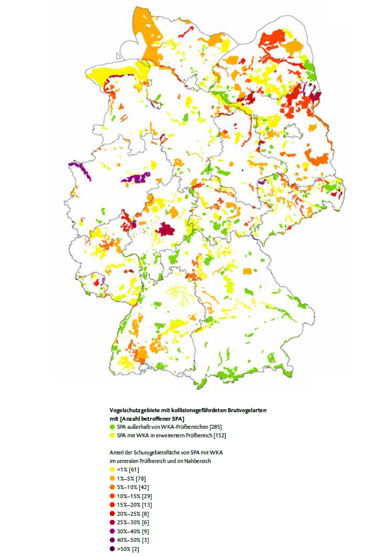 In nebenstehender Grafik entsprechen lediglich die grün eingezeichneten Anlagen den Vorschriften. Alle anderen farblich ausgewiesenen Anlagen verletzen die Vogelschutzrichtlinien.